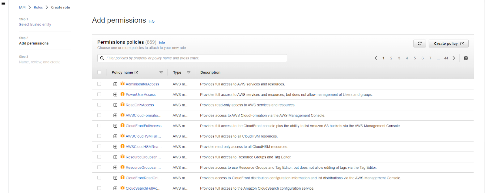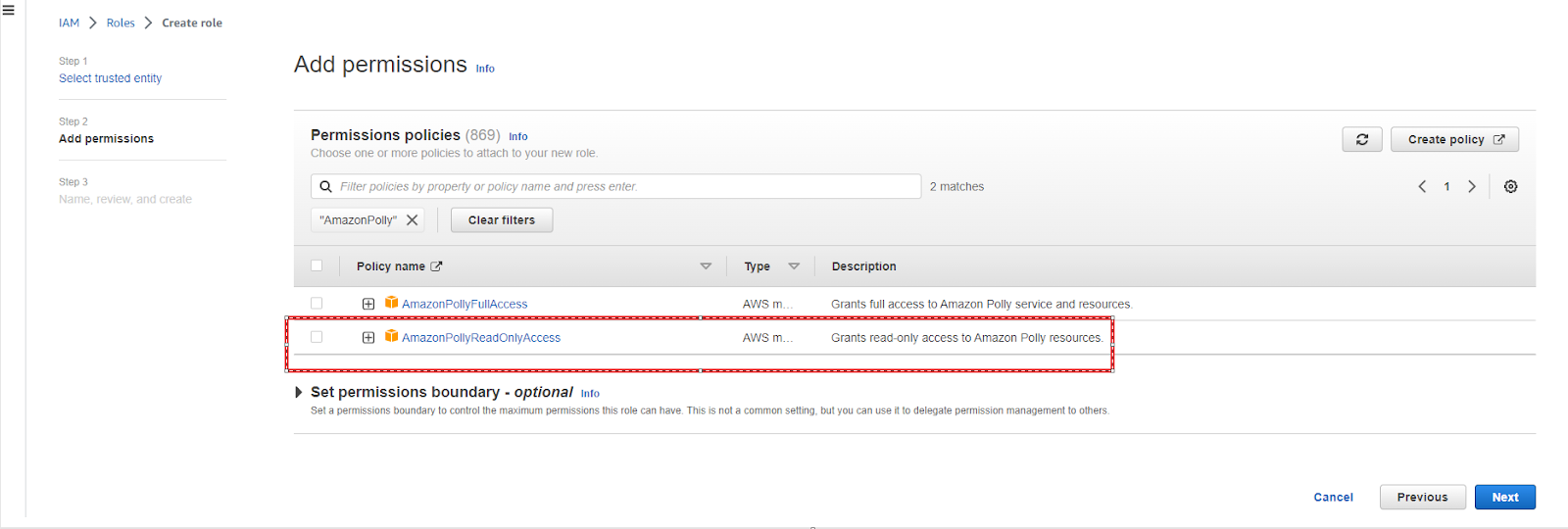 Search for AmazonPollyReadOnlyAccess and select the policy