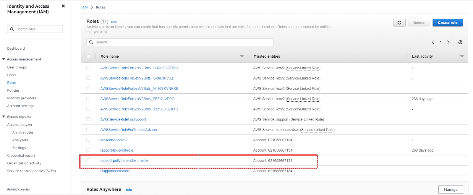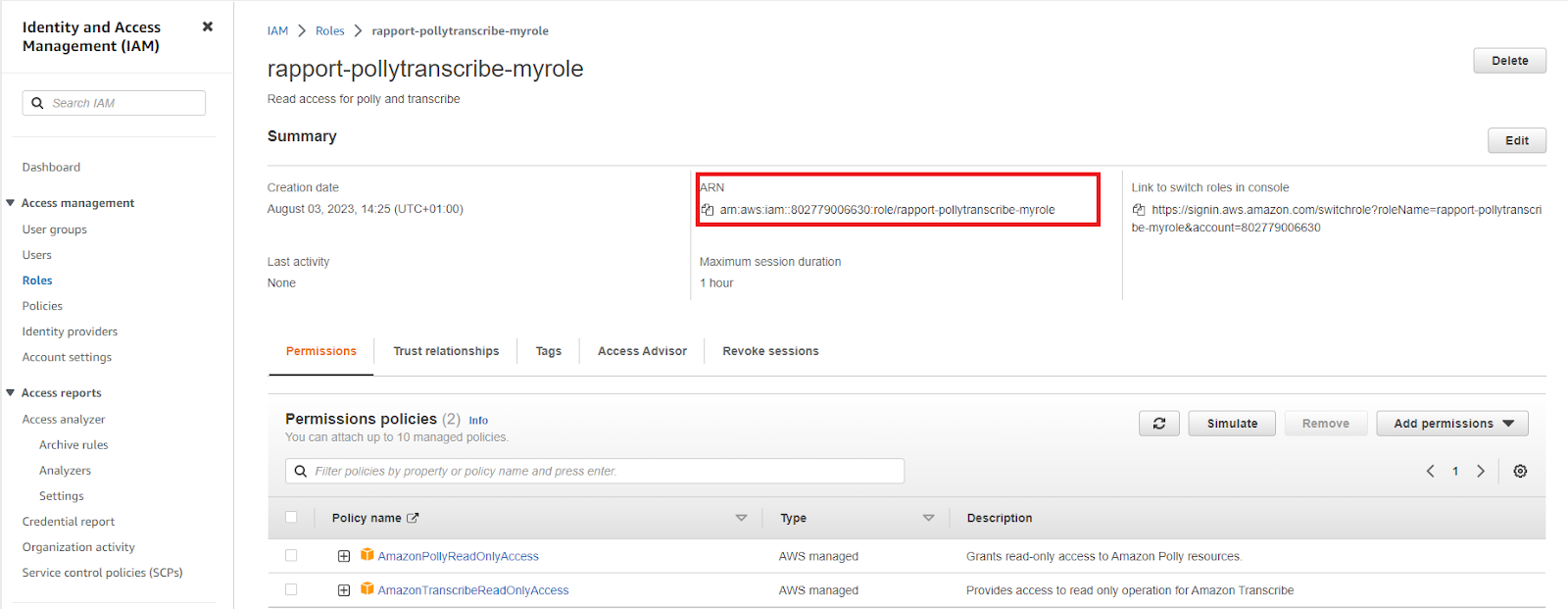 Arn:aws:iam::123456789123:role/rapport-namegiven-myrolePlease note the number is your AWS account number and the name starting with rapport- is the name that was created in a previous step.