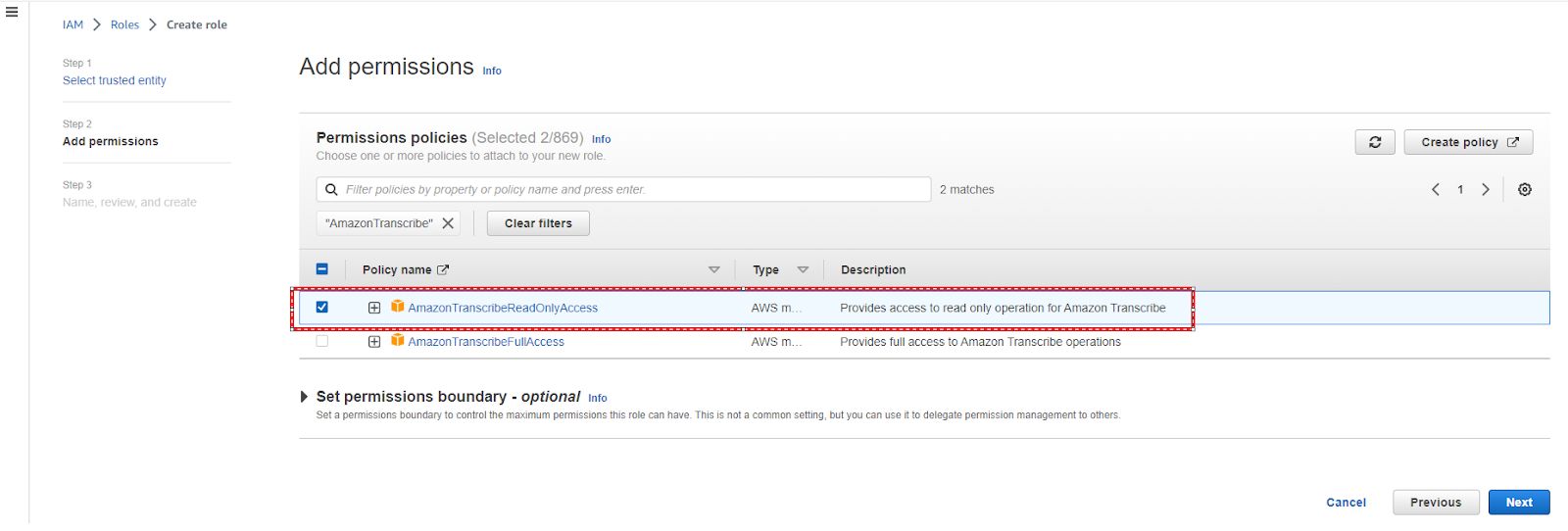 Search for AmazonTranscribeReadOnlyAccess