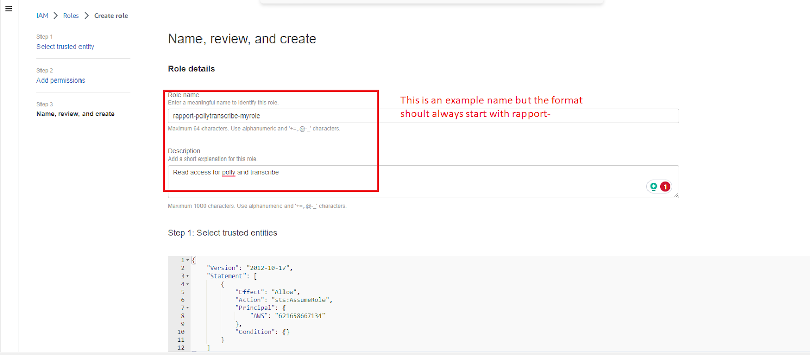 *Please note* - To ensure consistency, we have implemented new requirements for the role name. It must begin with "rapport-". Please double-check that the name you enter meets this criterion.